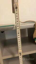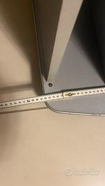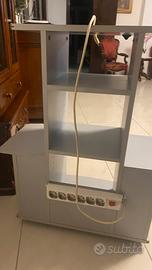 Carrellino porta TV colore grigio-argento con rotelline. Altezza 93 cm, larghezza max 74 cm, profondità max 40 cm. Compresa multipresa ciabatta 6 posti. Ante a vetro da sistemare.