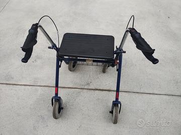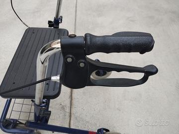 Carrellino di guida e supporto per anziani. Ruote in gomma, adatte anche su pavimenti sconnessi, silenziose. Seduta comoda, impugnatura ergonomiche, rete per la borsa della spesa.