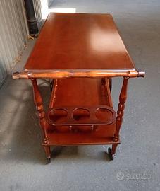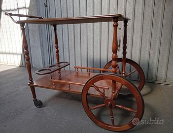 Vendo carrello bar portavivande, interamente in legno con 2 ruotine in metallo e 2 grandi in legno, doppio piano d’appoggio, con piano inferiore con 3 appositi spazi portabottiglie, adatto a vari tipi di arredo.