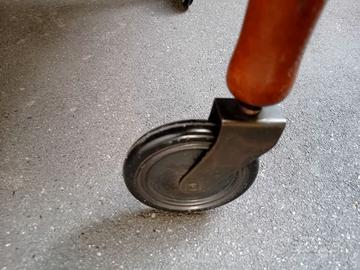 Misure : altezza totale 77 cm, altezza piano superiore 70 cm, profondità 52 cm compreso di mozzi ruote, misure piano superiore 45 x 74 cm, lunghezza tot. 1 metro, diametro ruota anteriore 39 cm, diametro ruotine posteriori 8 cm.