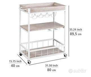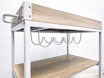 Vendo carrello bar con portabottiglie e portabicchieri come nuovo. Vendo per cambio arredo. Il piano superiore è un vassoio che grazie alle due maniglie laterali è facile da sollevare e trasportare. Le misure sono tra le foto