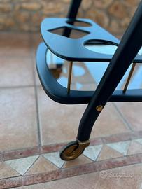Iconico carrello bar portavivande design anni 50 di Cesare Lacca. Produzione italiana. Struttura in legno dotato di due piani, nell’inferiore zona porta bottiglie e primo ripiano usabile come comodo vassoio. Riverniciato in colore nero opaco, dettagli in ottone.