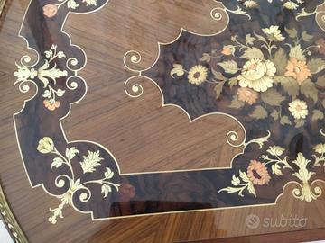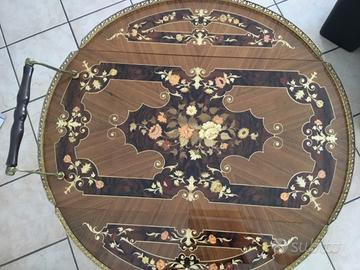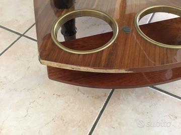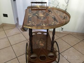 Carrello bar anni 50 in legno e finiture ottonate, diametro 75 cm. altezza 70 cm. sponde reclinabili . Unico difetto evidenziato in foto.