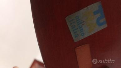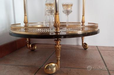 Iconico carrello bar, carrello porta vivande del designer Aldo Tura - Milano, Italia anni '40 -'50. I ripiani tondi sono realizzati in legno rivestito in pelle di capra / pergamena tinta a mano e rifinita a tutto spessore con lacca lucida. Il colore marrone realizzato con un effetto nuvolato contrasta elegantemente con le rifiniture in ottone. Le parti in metallo sono in ottone nichelato dorato, con particolari finemente cesellati sia sulle gambe che sulla maniglia. Le rotelle bellissime ed eleganti sono elemento distintivo di Aldo Tura. Presente sul retro di un ripiano l'adesivo della Tura Milano. Le forme geometriche e lineari vengono abbinate a materiali ricercati e preziosi, rendendo questo carrello un accessorio funzionale e al tempo stesso un pezzo di design eclettico dal grande fascino glamour. Ottime condizioni vintage! Segni compatibili con l'età che non ne diminuiscono la bellezza come lievi graffi superficiali sui ripiani praticamente non evidenti, leggere ossidazioni e in certi punti delle parti in metallo il colore oro è sbiadito. Disponibili altre foto. Altezza al ripiano 66 cm (alla maniglia 73cm) Larghezza del ripiano 53,5 cm ( compresa la maniglia 60 cm) Nato nel 1909 il designer-produttore Aldo Tura fonda la sua casa di produzione nel 1939 in Lombardia, lavorando tra lo stile Art Déco e quello modernista. Tura crea mobili ed accessori singolari e di lusso, caratterizzati da materiali ricchi ed esotici, forme scultoree, e tecniche artigianali esclusive, come l'utilizzo di pelle di capra/pergamena tinte a mano utilizzando tonalità accese. Tura predilige l’utilizzo di forme complesse e di tecniche difficilmente riproducibili per mantenere una produzione limitata ma di alta qualità. Il Brooklyn Museum a New York possiede diversi lavori di Tura, che erano originariamente esposti nella mostra itinerante “Italy at work: Her Renaissance in Design Today”. Ritiro a domicilio, pagamento in contanti. Vendita tra privati, non si accettano resi.