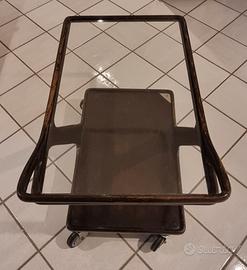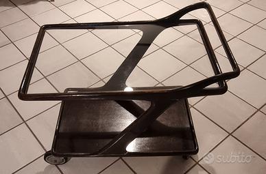 Bellissimo carrello bar vintage originale anni ’50, in legno curvato con ripiani in vetro. Linee eleganti e sinuose tipiche del design italiano del dopoguerra, perfetto come complemento d’arredo per salotto, studio o ambiente moderno/vintage. Lunghezza: 74 cm Altezza: 70 cm Larghezza: 48 cm Da restaurare