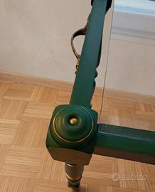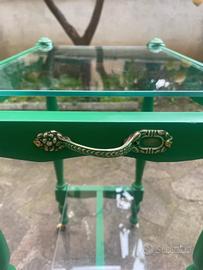 Il fascino del classico incontra l'audacia del colore. Questo carrello bar (o porta-vivande) non è solo un mobile funzionale, ma un vero pezzo d'accento capace di rigenerare l'atmosfera di qualsiasi ambiente, dal salotto moderno allo studio professionale. ✨ I Punti di Forza: Restyling Esclusivo: La struttura originale in legno è stata rivisitata in una vibrante tonalità Verde Smeraldo (Jewel Tone), colore di grande tendenza nell'arredo luxury. Dettagli Preziosi in Oro: Le eleganti rifiniture dorate sulle borchie superiori, sui giunti torniti e sui piedini creano un contrasto sofisticato e luminoso. Doppio Ripiano in Vetro: I due piani in vetro trasparente mantengono la struttura visivamente leggera, permettendo di mettere in risalto bottiglie di pregio, cristalli o oggetti d'arte. Ferramenta Vintage Originale: Le splendide maniglie lavorate in stile retrò conservano il fascino dell'epoca e garantiscono una presa solida per lo spostamento. Massima Versatilità: Grazie alle funzionali ruote dorate, può essere utilizzato come raffinato angolo bar, carrello di servizio o originale porta-piante da interno. Stato: Ottimo stato conservativo, pronto per arredare la tua casa. Misure: Larghezza 45 cm Profondità 31 cm Altezza 71 cm