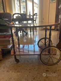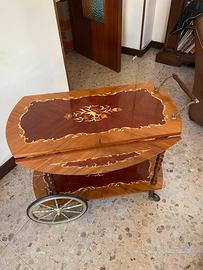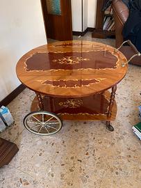 Carrello elegante bar vintage in legno con raffinati intarsi floreali sul piano superiore e inferiore stile Hollywood Regency. Dotato di maniglia in ottone, ruote per lo spostamento e meccanismo che permette di allungare il piano superiore. Nel piano inferiore è presente un porta bottiglie in ottone con tre postazioni.