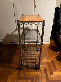Vendo semovente carrello in alluminio con quattro rotelle e tre ripiani di appoggio di cui uno in legno, ideale per arredare la stanza di studenti fuori-sede ovvero lavoratori in smartworking e/o comunque da remoto, per la sistemazione di angolo studio o ufficio con torre di pc desktop, stampante, modem-router e altri dispositivi, dotato di maniglione per il comodissimo trasporto.