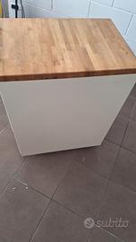 carrello con rotelle tre cassettoni colore beigeve piano in legno.