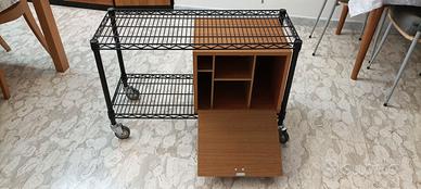 Carrello DUEPIU’ in ferro verniciato nero con ruote, dimensioni circa L90 x p30 x h57. In aggiunta, un mobiletto, in melamina, di larghezza circa 40 cm (non fissato e quindi eventualmente amovibile), con interno suddiviso in piccoli scomparti. La composizione è stata pensata quale porta hi fi ed il mobiletto per dischi in vinile ed accessori; può contenere circa 40/45 dischi 45 giri e circa 25 LP 33 giri, oltre a cuffie ed eventuali prodotti per la pulizia dei dischi. Il prezzo è da intendersi per entrambi i pezzi (carrello e mobiletto). Per mancanza di imballi adeguati, non è prevista la spedizione. Il carrello, pertanto, deve essere ritirato, previa visione ed accettazione delle condizioni di stato, prima della conclusione della vendita presso il recapito che sarà fornito agli eventuali interessati. Non si accettano richieste di contatti e/o contrattazioni telefoniche.
