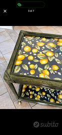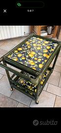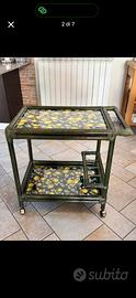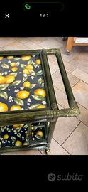 Bellissimo e funzionale carrello in ramino e tessuto, completamente fatto a mano in Italia. Con portabottiglie e possibilità di togliere le ruote. Nessun particolare segno di usura, da considerarsi perfetto. Misure: lunghezza 74 cm compresa la maniglia 64 cm senza, altezza 70 cm, profondità 46 cm. Possibilità di portare l’oggetto all’acquirente, se in zone limitrofi alla mia!!!