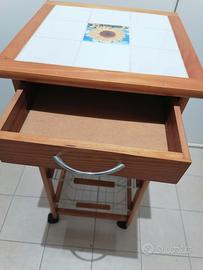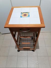 carrello da cucina con piano in piastrelle disegno girasole, cassettino e 2 cestelli in metallo, il tutto è realizzato in legno con 4 ruote che permettono il facile spostamento