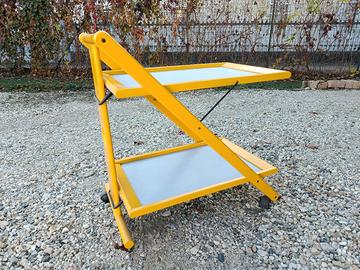 Carrello in legno laccato giallo con 2 ripiani grigi e rotelle