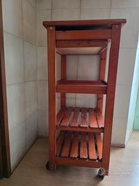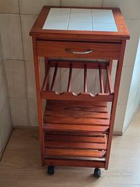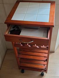 carrello pratico e funzionale, perfetto per organizzare al meglio il tuo spazio. piano superiore con finitura in ceramica. scomparto porta bottiglie. due ripiani a listelli. cassetto con maniglia. ruote per un facile spostamento.