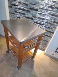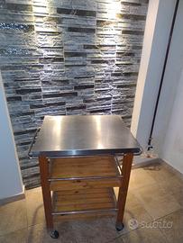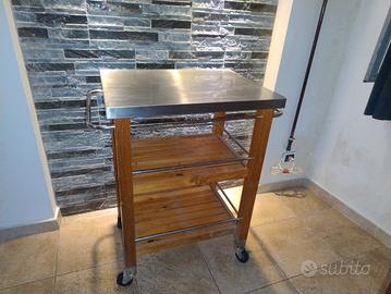 adatto ad interno o esterno, tre piani d'appoggio con top in acciaio, dotato di maniglie e ruote gommate con freni.