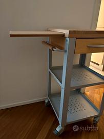 Splendido carrello da cucina in legno e metallo, con ruote (sistema di blocco) e completo di ampio cassetto su un lato, e sull’altro, a estrazione, piano supplementare di appoggio o per impastare. Comoda maniglia laterale porta asciugamani e appendi mestoli. Due comodi ripiani rendono il carrello un pezzo di arredo e al contempo utilissimo. In ottimo stato. In ottimo stato con modesti segni per sporadico uso. Misure: Piano in legno quadrato cm 46,5x 46,5. Misura larghezza laterale inclusa la maniglia 55 cm. Altezza incluse ruote altezza cm 91. Luce tra il 1° ripiano e il 2º cm. 37 . Tra il 2º e il 3º ripiano (sotto il cassetto) 28 cm. Altezza interno cassetto cm. 8,5