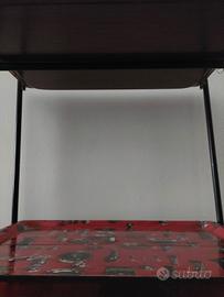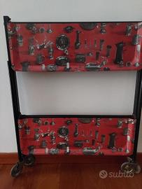 Carrello cucina vintage, con disegni di oggetto in peltro. Anni 50/60. Conservato molto bene nonostante gli anni. Oggetto raro e particolare. Misure dispiegato 65cm x 41.5cm x 67cm - piegato 85cm x 7cm x 67cm Si adatta dietro quasi tutte le porte. il mio non presenta marchi ma è identico ad un modello sul web in vendita marchiato Dinett.