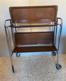 Carrello design GERINOL anni 70 pieghevole. Supporto in acciaio, 2 piani in plastica. Misure aperto: altezza cm.70x65x41. Misure chiuso: altezza cm.84x65x8. Condizioni: molto buone. Le ruotine hanno delle macchie di ruggine superficiali.