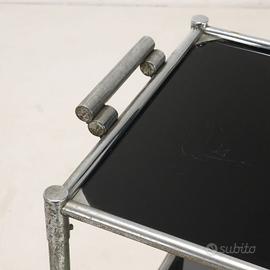 Carrello con piano in vetro opalino nero e plexiglass, struttura in alluminio