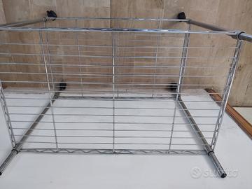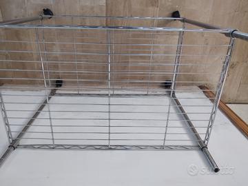 Vendo carrello/ scaffale a due ripiani con ruote in filo di acciaio cromato. I ripiani possono essere messi all' altezza desiderata.