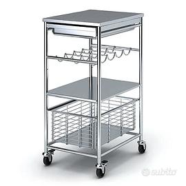Carrello della serie Grundtal di Ikea, in acciaio, usato in ottime condizioni. Dimensioni e Peso Lunghezza: 54 cm. Larghezza (Profondità): 41 cm. Altezza: 90 cm. Peso totale: Circa 14,50 kg. Materiali di Costruzione Struttura, Piano e Ripiani: Acciaio inossidabile, scelto per la sua resistenza alla ruggine e facilità di igienizzazione. Cassetto: Realizzato in acciaio inossidabile con guide in plastica acetalica. Vassoio interno: Acciaio. Piedini/Ruote: Plastica propilenica. Caratteristiche Funzionali Piano superiore: Superficie liscia utilizzabile come piano di lavoro aggiuntivo. Cassetto estraibile: Posizionato sotto il piano superiore per riporre piccoli utensili o posate. Ripiano portabottiglie: Integrato, con capacità per circa 4-5 bottiglie. Cesto metallico: Un cestello a rete profondo ed estraibile alla base per oggetti ingombranti (es. pentole o sacchi di patate). Mobilità: Dotato di 4 ruote, di cui 2 con sistema di bloccaggio per garantire la stabilità durante l'uso.