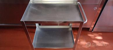 carrello in acciaio inox, ottimo stato, h 81 cm larghezza cm 71, profondità cm 51, quattro ruote, maniglia, due ripiani, bordo anti-caduta.