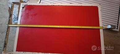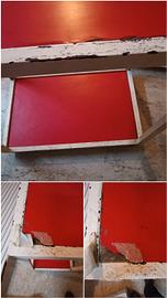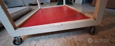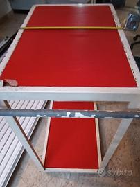 vendo carrello in ferro con maniglione, equipaggiato con ruote USATO, con due piani di appoggio in truciolato rivestito in formica di colore rosso. il piano superiore presenta sul lato SX un pezzetto scorticato come in foto. I ripiani possono essere sostituiti il carrello non è smontabile è tutto saldato.(non disponibile spedizione )con una mano di vernice ritorna come nuovo. Prezzo affare. H 93,5cm con ruote L80cm +10cm maniglione. P50cm
