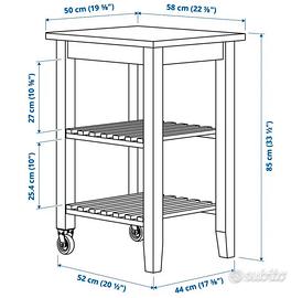 Vendo mobile carrello Ikea, in legno (non tamburato/truciolare), modello bekvam, ingombro 58x50 cm, altezza 85 cm, con due ripiani e due ruote. Molto stabile, vendo per cambio arredamento. Consegna a mano o spedizione senza problemi, ma pesa 17 kg, per cui il costo sarebbe abbastanza alto