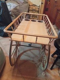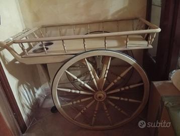 Carrello in legno in stile vintage, utilizzato per scopi espositivi o decorativi o come elemento di arredo in giardini o verande.