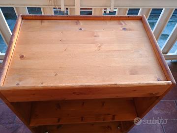 carrello in legno massello con doppio ripiano e bordo superiore. già montato e con ruote piroettanti con freno. misure 77x62x39,5 cm.