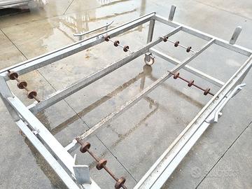 carrello inox con vasca mobile usato, si tratta di una base carrellata completa di vasca in acciaio inossidabile adatta per il trasporto di materie prime in ambienti in laboratori di produzione alimentare.