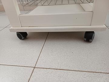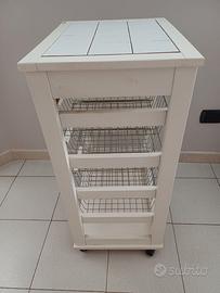 Carrello Maslegno - multiuso - in legno - ideale per cucina, bagno o lavanderia - dotato di un comodo cassetto superiore (ha imperfezioni sul fondo, come da foto) e 4 cestelli in metallo estraibili - con ruote - colore bianco - dimensioni 82x48x38 cm circa. Ottime condizioni con normali segni di utilizzo, come da foto.