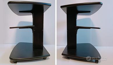 Carrello polifunzionale: porta-tv, RAC, stereo, con 3 piani di sezione trapezoidale, in lacca nera con bordi arrotondati. Colonnina posteriore passacavi con fori alimentazione elettrica e tv, con barre interne di rinforzo in metallo, 5 rotelle piroettanti. Prodotto italiano. Buone condizioni generali, lieve usura, alcune leggere righe sui piani, piccole mancanze nella parte posteriore.