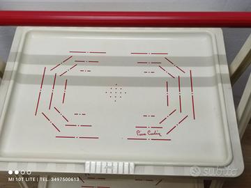 Raro carrello portavivande pieghevole firmato Pierre Cardin per Simo, autentico pezzo di modernariato degli anni '70. Questo oggetto incarna perfettamente l'estetica funzionale dell'epoca: struttura in resina color crema arricchita da grafiche geometriche rosse e dalla firma iconica dello stilista sui ripiani. Grazie al suo ingegnoso sistema di chiusura, il carrello può essere riposto in pochissimo spazio, rendendolo un complemento d'arredo tanto bello quanto pratico. Ideale per amanti del design "Space Age" e collezionisti.