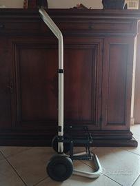 3 livelli di regolazione in altezza: 107 - 97 - 87 cm. Telaio in alluminio, ruote in plastica diametro 12 cm. Misura ripiano bombola: 19x 15 cm.