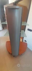 Il carrello ha la base per oppoggio tv colore ciliegio, con due cassetti a scomparsa in acciaio, con colonna per fili in acciao con due mensole in vetro infragibile e satinato.