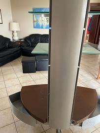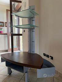 Carrello porta Tv con due mensole in vetro, ripiano in legno color noce scuro. Due cassetti laterali. Munito di ruote