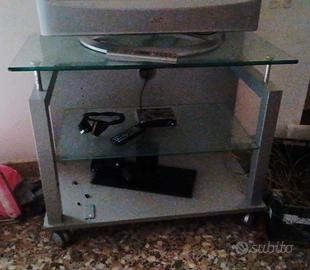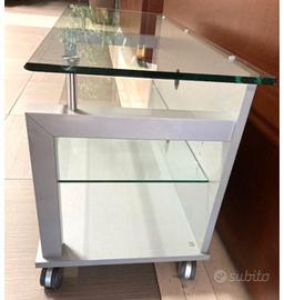carrello porta TV(o tavolino porta TV) con ruote, caratterizzato da una struttura moderna che combina metallo e vetro.