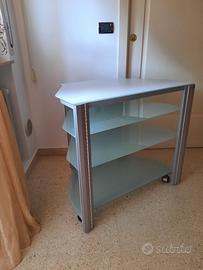 Carrello porta TV con ripiani in vetro e ruote per poterlo spostare facilmente. Nella parte posteriore è possibile inserire i cavi elettrici per non averli in vista ma ordinati.