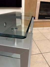 Vendo Carrello porta TV in struttura in alluminio e legno e piano in vetro con molatura sui bordi, con ruote con freno e fori per passare i fili. misure cm.: 100x40x54h