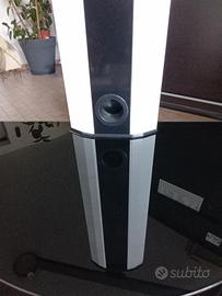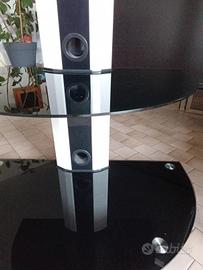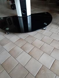 carrello con. supporto rettangolare leggermente movibile per TV due ripiani in vetro asta con foro per passaggio fili ruote per spostarlo. Ottimo per abitazione o per ufficio . Da ritirare sul posto. Alto 116 lungo 65 profondità 40 cm