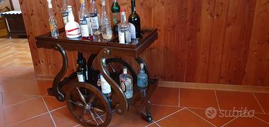 Bellissimo carrello in legno a due ripiani di cui uno estraibile a vassoio e tre contenitori per bottiglie.