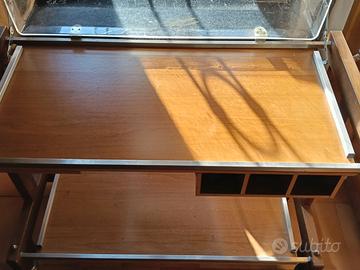 Presenta una struttura in legno a due piani con ruote per facilitarne lo spostamento.