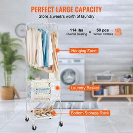 Costruito per Durare: il nostro robusto carrello portabiancheria con struttura in acciaio è progettato per resistere fino a 50 kg senza deformarsi o oscillare. La sua elegante superficie verniciata a polvere bianca aggiunge un tocco di stile e fornisce resistenza alla ruggine per un uso a lungo termine.