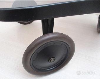 Elegante carrello moderno disegnato da Enzo Mari per Alessi nel 1989. Manubrio sopra un supporto laterale ad albero cilindrico, 2 ripiani in vetro temperato fumé, 3 ruote di cui una girevole, metallo colore nero. Come nuovo. Misure indicative 75x82x46 cm. Peso 12,5 kg.