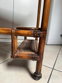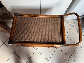 Vendo elegante carrello portavivande in legno con doppio ripiano e portabottiglie laterale.