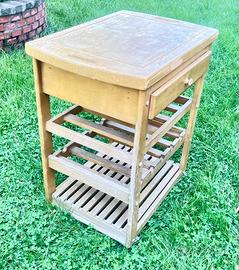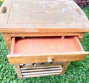 Usato, da verniciare, ottimo legno,4 ruote, cassetto, 3 piani (di cui un piano portabottiglie) + piano superiore. Mis. 74x50x86 h SOLO RITIRO. Prezzo trattabile.