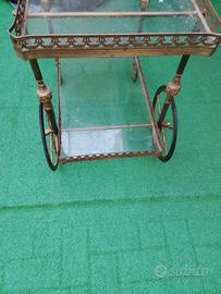 Vendo raffinato carrello portavivande in stile vintage, realizzato in metallo dorato con ripiani in vetro. Il design decorativo con dettagli in ferro battuto dona un tocco di eleganza e classe, perfetto per arredare salotti, sale da pranzo o per essere utilizzato come carrello bar.
