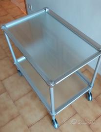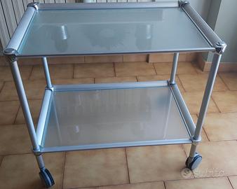Carrello portavivande / multiuso in vetro temperato e alluminio. Marca: Rede Guzzini. Sistema: Helsinki. Design: F. Minuti. Un pezzo da collezione di design minimalista che coniuga funzionalità ed eleganza. Presenta 2 ripiani in vetro temperato, giunti in stile industriale e ruote. Dimensioni: 74 cm x 48 cm. Altezza 70 cm. COME NUOVO. Rivoli (TO). Solo ritiro.