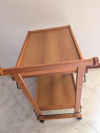 Carrello portavivande del marchio Valsecchi di legno color ciliegio, con 2 ripiani di appoggio e dotato di rotelle che lo rendono pratico e comodo da utilizzare. Richiudibile in modo da poterlo riporre in uno spazio ridotto. Il piano misura 40x60.